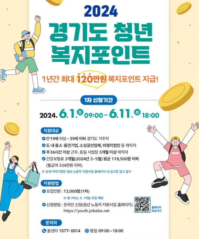 경기도가 도내 청년 노동자들의 복리후생을 개선하기 위해 연간 120만 원의 복지포인트를 지급하는 '청년 복지포인트' 사업의 1차 참여자 1만 3,000명을 6월 1일부터 11일까지 모집합니다. '청년 복지포인트' 사업은 경기도에 소재한 중소·중견기업, 소상공인업체, 비영리법인에서 주 36시간 이상 근무하는 월 급여 334만 원 이하의 19~39세 청년이 대상입니다. 병역의무를 이행한 경우, 그 기간만큼 신청 연령이 연장됩니다.