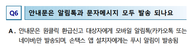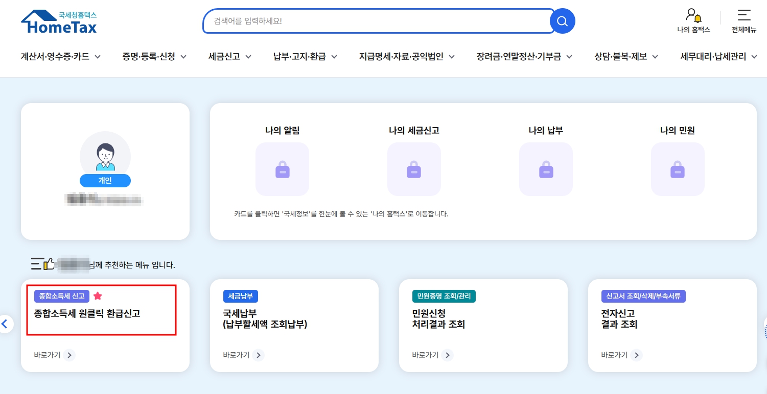 국세청에서 모바일 안내문(카카오톡, 네이버 알림톡) 또는 손택스 푸시 알림을 받은 경우 홈택스 접속 후 ‘종합소득세 원클릭 환급신고’ 메뉴에서 환급금 조회 가능 손택스(모바일 앱) → ‘자주 찾는 메뉴’ → ‘종합소득세 원클릭 환급신고’에서 확인 가능