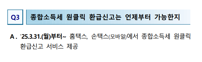 국세청이 2025년 3월 31일부터 ‘종합소득세 원클릭 환급신고’ 서비스를 시행했습니다. 이 서비스는 납세자들이 홈택스 또는 손택스를 통해 간단하게 종합소득세를 신고하고 환급받을 수 있도록 돕는 시스템입니다. 특히, ‘삼쩜삼’ 등 민간 세무 플랫폼을 이용하지 않고도 수수료 없이 환급 신청이 가능해졌습니다. 이번 기사에서는 종합소득세 원클릭 환급신고 대상, 방법, 주의사항 등을 자세히 알아보겠습니다.