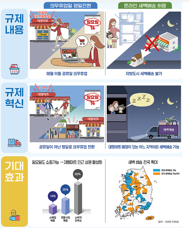 특히 대형마트 주말 휴무로 평일 쇼핑이 어려운 맞벌이 부부, 1인 가구 등을 중심으로 국민 불편이 증가하고 있으며, 새벽배송은 수도권 및 대도시 인근 지역을 중심으로 시행됨에 따라 수도권-지방 간 정주여건 격차를 확대시키고 있다.  유통시장 경쟁구조도 ‘대형마트 vs 골목상권’에서 ‘오프라인 vs 온라인’으로 변화해 영업규제 도입 당시와 유통환경이 변화했다.
