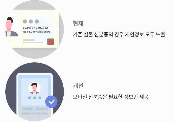 모바일 신분증은 자기 정보 결정권 강화로 개인이 스마트폰 안에 자신의 정보를 보유하고 직접 꺼내쓸 수 있으며, 신원증명을 위해 필요한 정보만 골라서 제공할 수 있습니다.