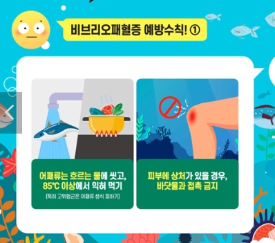 • 어패류는 흐르는 물에 깨끗이 씻고, 85℃ 이상에서 충분히 익혀 먹기. 특히 고위험군은 어패류 생식을 피해야 합니다.