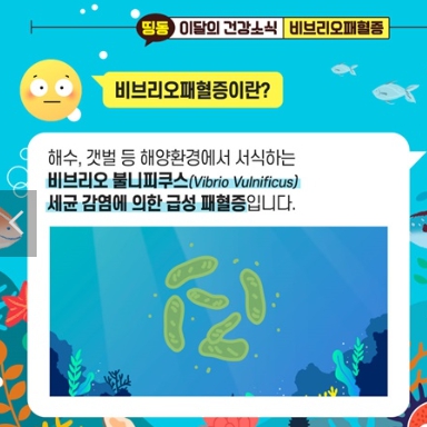 비브리오패혈증은 해수, 갯벌 등 해양환경에서 서식하는 비브리오 불니피쿠스 (Vibrio Vulnificus) 세균에 감염되어 발생하는 급성 패혈증입니다. 이 세균은 해산물이나 오염된 바닷물과의 접촉을 통해 인체에 침투할 수 있습니다.