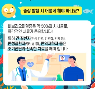 비브리오패혈증의 치사율은 약 50%에 이르기 때문에, 증상이 나타나면 즉각적인 치료가 필요합니다. 특히, 만성 간염, 간경화, 간암 등의 간 질환자나 당뇨병 등 만성질환자, 면역저하자는 조기진단과 신속한 치료가 매우 중요합니다.