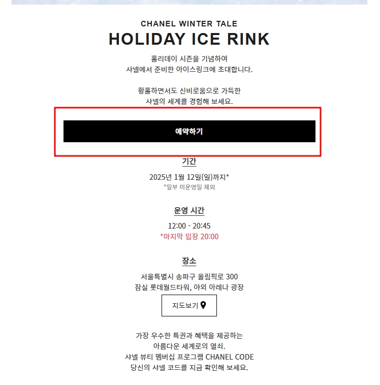 샤넬 아이스링크는 사전 예약제로 운영되며, 혼잡을 줄이고 방문객들에게 원활한 경험을 제공하기 위해 입장 인원이 제한됩니다.