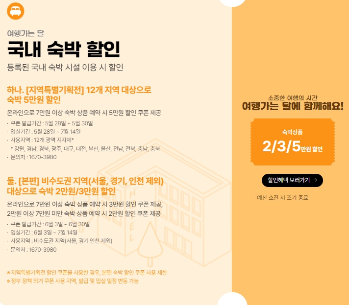 50,000원에서 70,000원 이상의 국내 숙박상품 예약 시 할인을 받을 수 있습니다. 단, 지역특별기획전 숙박할인권을 사용한 경우 본편 숙박할인권(2/3만원권, 6월 3일~6월 30일) 발급이 제한됩니다.