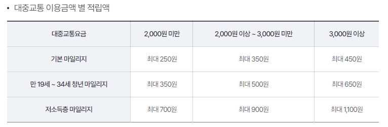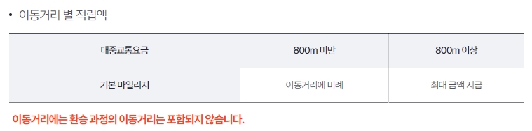 위치 추적을 통한 마일리지 적립도 있습니다. 교통카드로 이동한 만큼 걸어가거나 자전거를 이용한 만큼을 마일리지로 적립합니다. 출발지에서 목적지까지 거리 중 대중교통 이용 전후의 걸음 거리를 최대 800m까지 계산해 주며, 이를 마일리지로 환급받을 수 있습니다.