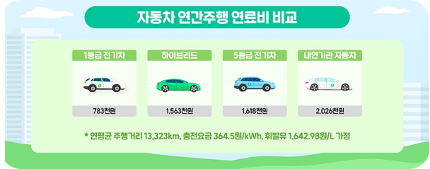 전기차 에너지효율 1등급에 해당하는 아이오닉6의 연간 충전요금은 약 78만 원으로, 5등급 전기차의 충전요금인 약 162만 원보다 약 84만 원 정도 저렴합니다. 이는 내연기관차(203만 원)나 하이브리드차(156만 원)의 연간 연료비보다도 절반 이하로 예상됩니다.