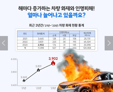 차량 화재는 생각보다 자주 발생하는 사고입니다. 최근 3년간 대한민국에서 발생한 차량 화재는 연평균 3,799건에 달하며, 이로 인해 매년 27명이 목숨을 잃고 약 149명이 부상을 입는 것으로 집계되었습니다. 이러한 사고는 대부분 엔진 과열, 전기적 결함, 연료 누출, 교통사고와 같은 다양한 원인으로 발생합니다. 차량 내부는 플라스틱, 고무, 합성섬유 등 가연성 물질로 구성되어 있어 불이 붙으면 화재가 급격히 확산됩니다.
