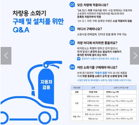 차량용 소화기는 단순한 장비가 아니라 생명을 구할 수 있는 필수 안전 도구입니다. 2024년 12월 1일 이후부터 시행되는 소화기 의무화 규정을 준수함으로써 자신의 안전을 지키고 법적 책임도 충족할 수 있습니다. 나아가 모든 차량 소유자가 미리 소화기를 준비하고 사용법을 익혀 화재 발생 시 효과적으로 대응할 수 있기를 바랍니다.