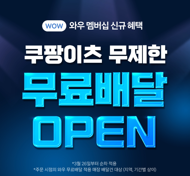 쿠팡이츠가 무제한 무료 배송을 시작한다고 오늘 밝혔습니다. 와우 회원은 쿠팡이츠에서 배달비 없이 음식을 주문할 수 있게 됩니다.