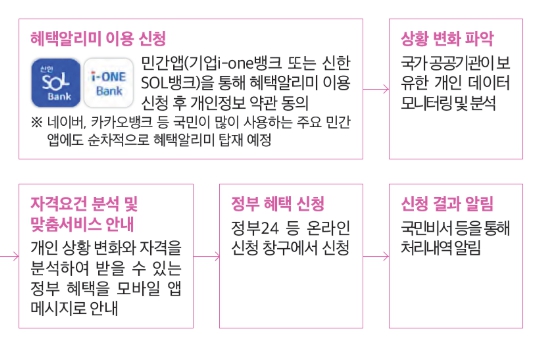 ‘혜택 알리미’는 행정·공공기관이 보유한 정보를 바탕으로, 나의 상황 변화를 감지하고 받을 수 있는 혜택을 추천·신청까지 연계해주는 스마트한 서비스입니다.