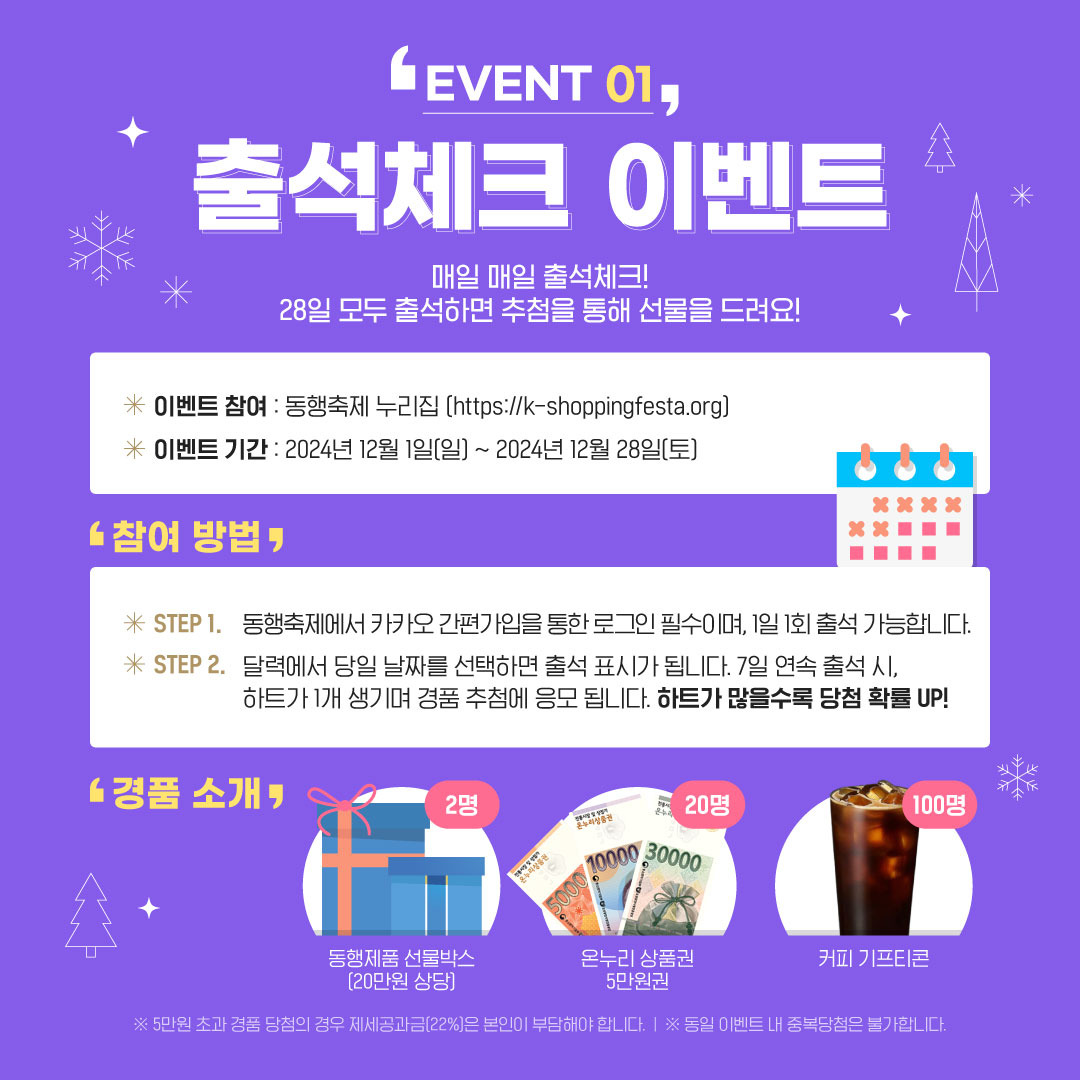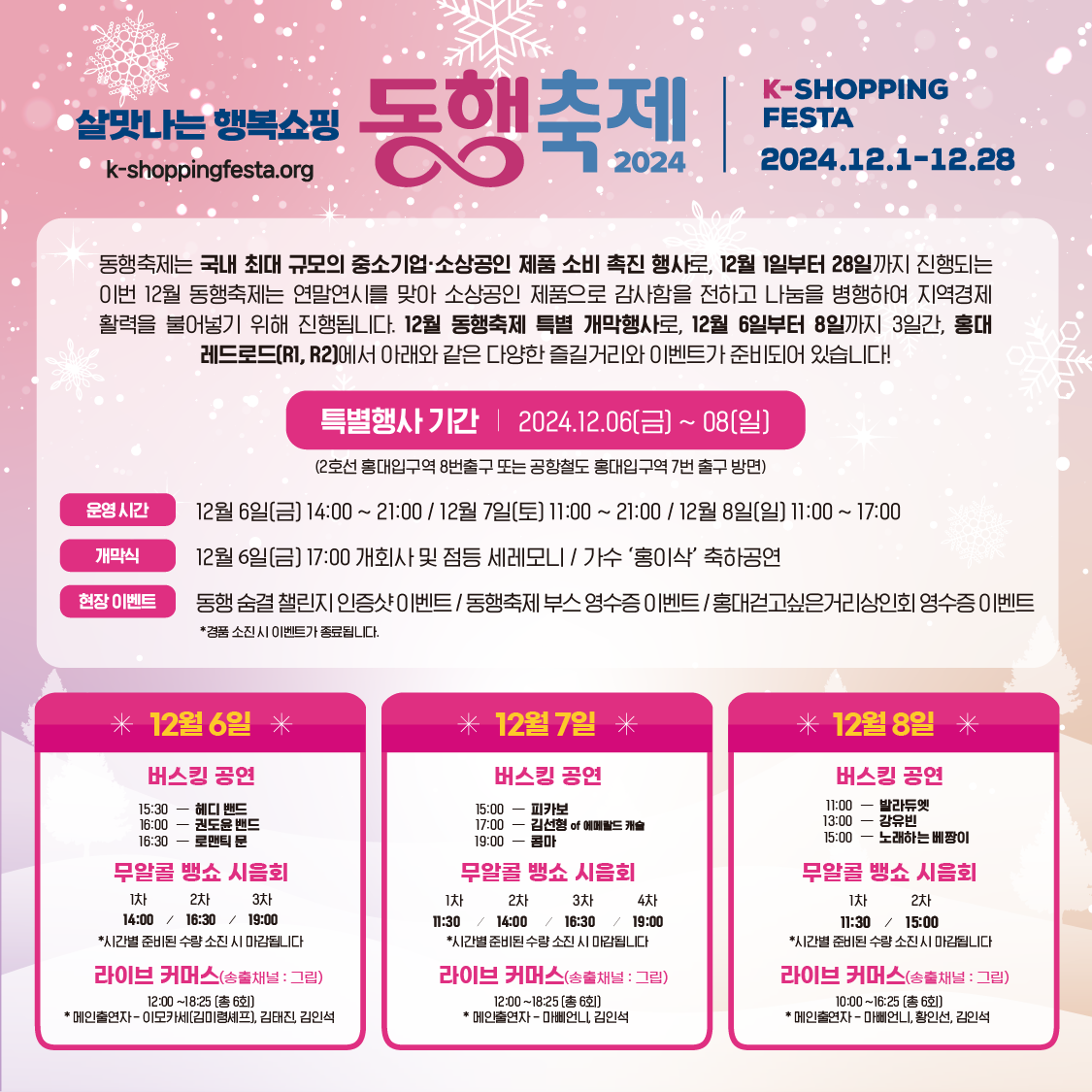 12월 동행축제는 소비자들에게는 합리적인 가격으로 질 좋은 제품을 구매할 기회를, 중소기업과 소상공인들에게는 매출 증대와 브랜드 홍보의 기회를 제공합니다. 연말연시의 따뜻한 분위기 속에서 쇼핑도 하고, 특별한 경험도 할 수 있는 이번 축제에 많은 관심과 참여 부탁드립니다.