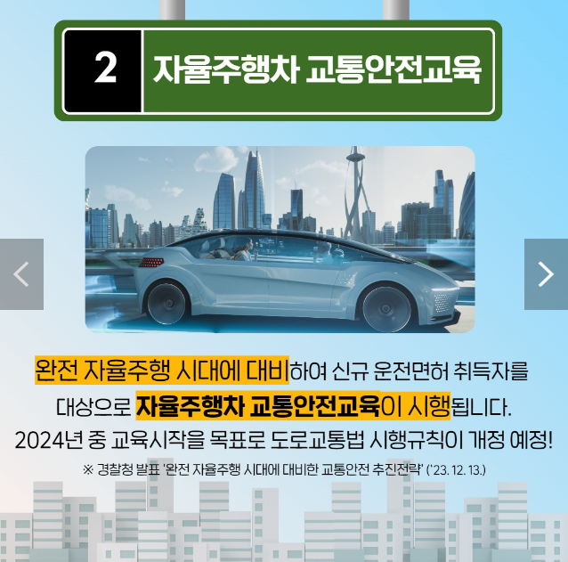 2. 자율주행차 교통안전교육 완전 자율주행 시대에 대비하여 신규 운전면허 취득자를 대상으로 자율주행차 교통안전교육이 시행됩니다. 2024년 중 교육시작을 목표로 도로교통법 시행규칙이 개정 예정! .