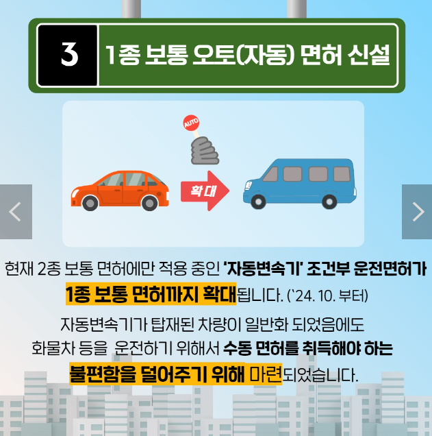 3. 1종 보통 오토(자동) 면허 신설 현재 2종 보통 면허에만 적용 중인 ‘자동변속기’ 조건부 운전면허가 1종 보통 면허까지 확대됩니다. (’24.10.부터) 자동변속기가 탑재된 차량이 일반화 되었음에도 화물차 등을 운전하기 위해서 수동 면허를 취득해야 하는 불편함을 덜어주기 위해 마련되었습니다.
