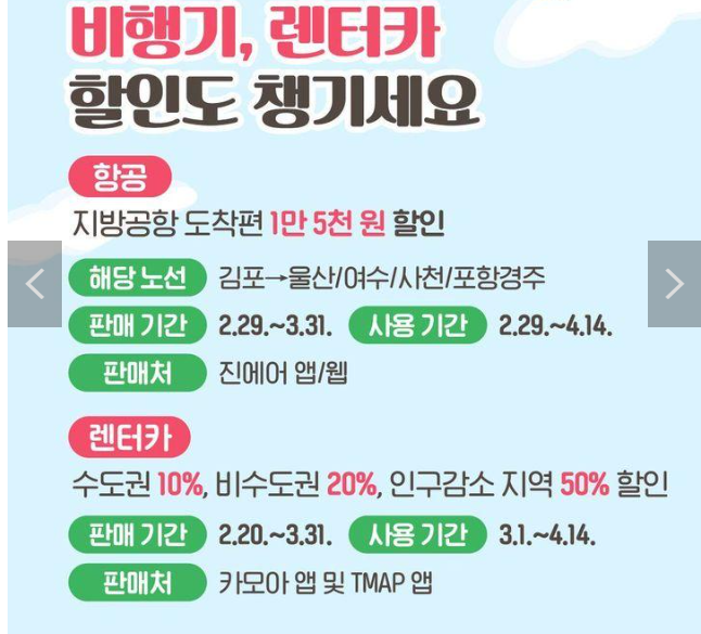 렌터카: 수도권 10%, 비수도권 20%, 인구감소 지역 50% 할인