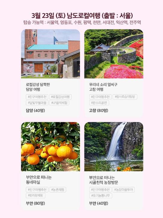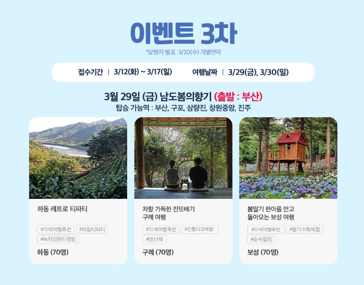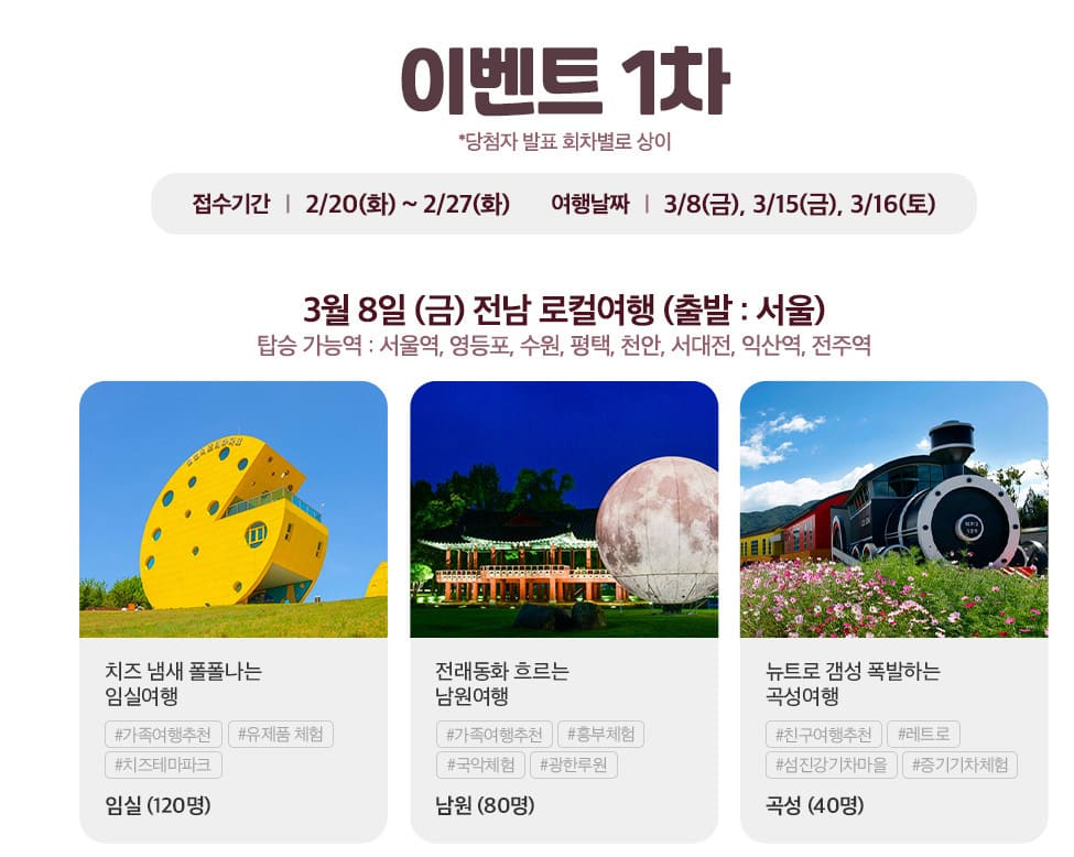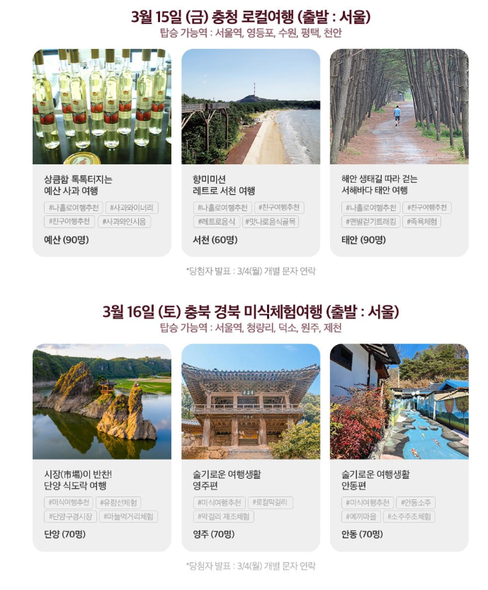 3월 혜택을 챙겨서 지역의 다채로운 매력을 즐겨보세요! 자세한 정보는 여행가는 달 누리집에서 확인하실 수 있습니다.