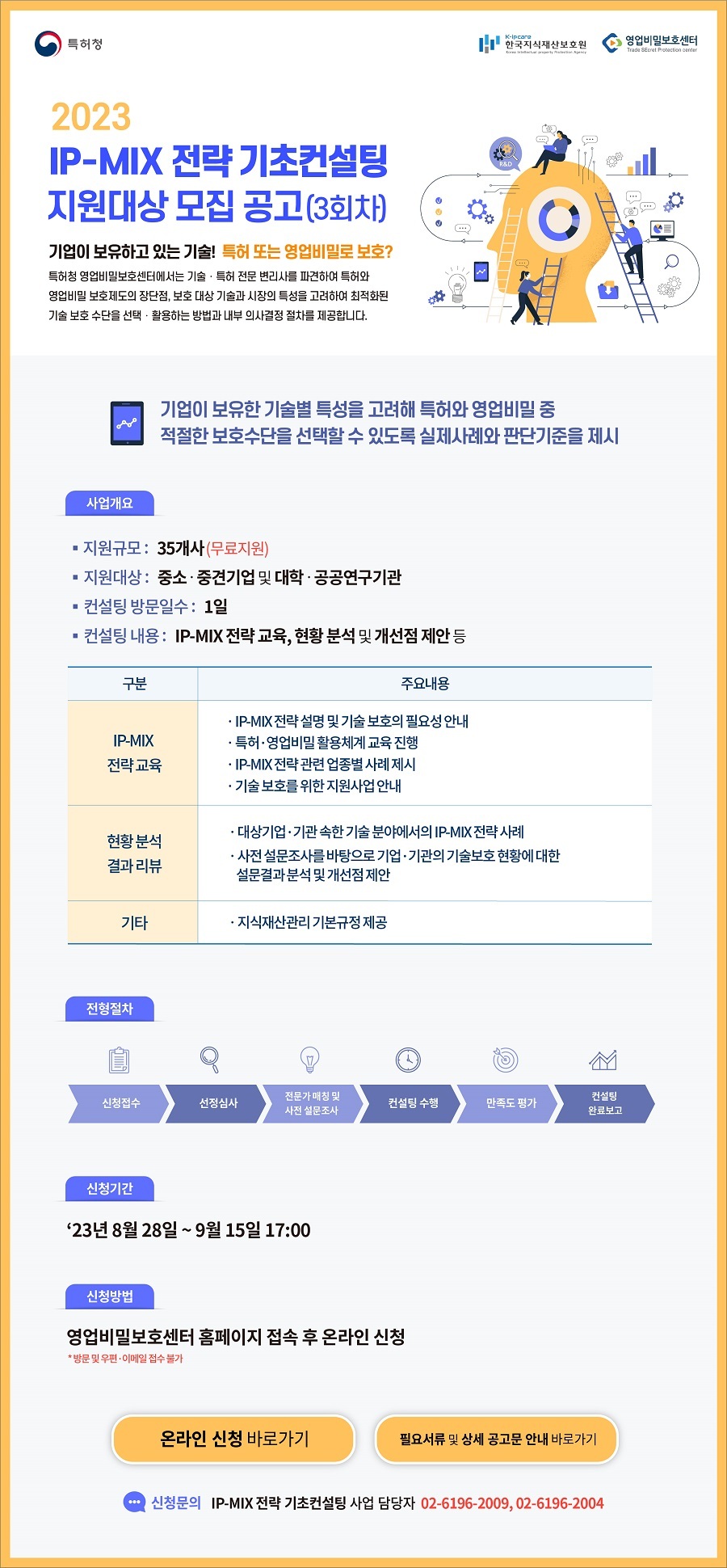 본 기초 컨설팅에서는 기업·기관이 보유한 기술 특성에 따라 특허ㆍ영업비밀 등지식재산 보호제도를 효과적으로 조합·활용 할 수 있는 맞춤형 IP-MIX 전략을 제시해드린다고 합니다.