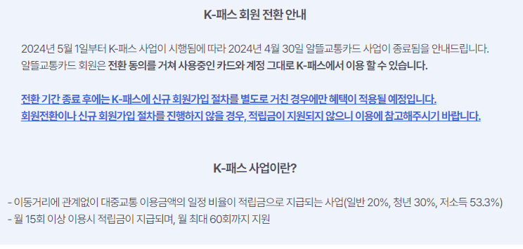- 기존 알뜰교통카드 앱이나 홈페이지에서 4월 30일까지 K-패스 메뉴를 통해서 회원 전환을 진행해야 하며 5월 1일에는 K-패스 앱으로 업데이트해야 합니다.